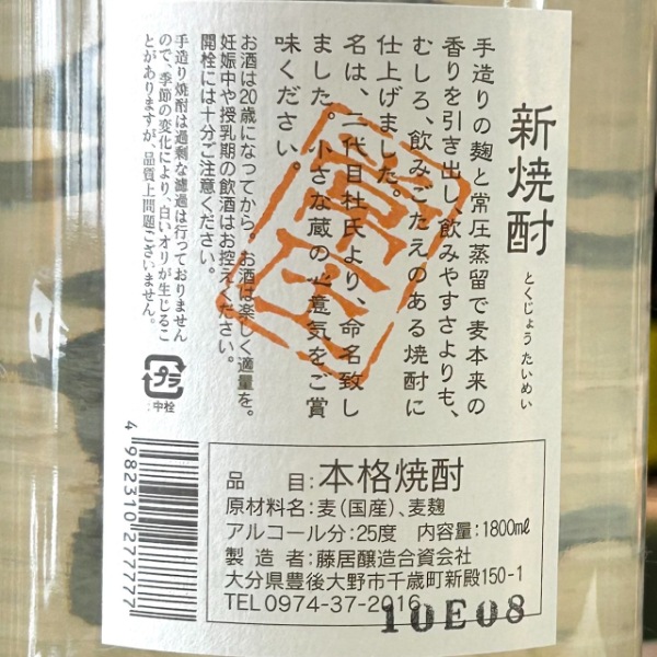 先代蔵元の名を冠した「泰明」は、「飲みやすい」ではなく「飲みごたえ」を目指した重量感のある麦焼酎。麦をローストしたような香ばしい風味が口内に溢れます。