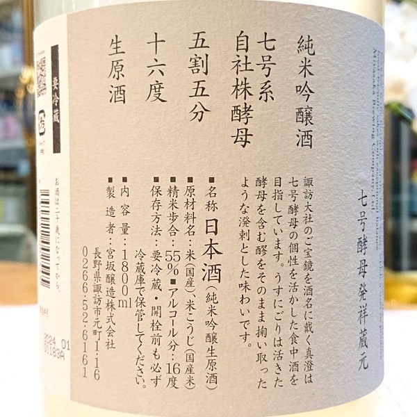 御柱祭でも有名な、長野県の諏訪の蔵元 (諏訪、富士見と2つの蔵があります)かつて行った徹底的な酒質向上で、「真澄」ブランドが全国区になりました。現在の清酒の約70%を占めると言われる7号酵母の発祥の蔵元でもあります。酒造好適米を100%使用し、その多くで長野県産米を使用するなど、地元に根差した酒造りを行います。
