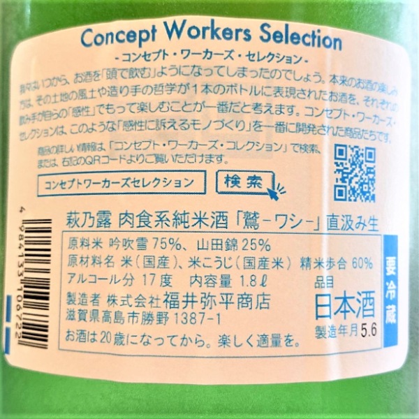 | 銘柄名 | 萩乃露 肉食系純米酒 ワシ 吟吹雪直汲み 生 |
