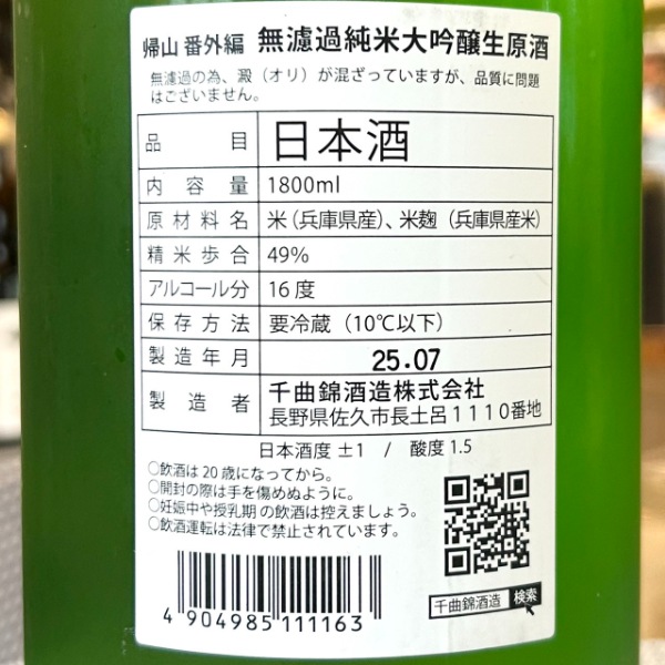 清酒、蕎麦焼酎の「帰山」は地酒特約店専門の銘柄。(「千曲錦」が一般流通酒。)「お酒の本来の旨みは甘味と酸味、最後に人が帰ってくるのはこの味わい」というコンセプトを元に造られ、「帰るべきところ」という意味で「帰山」と命名されました。