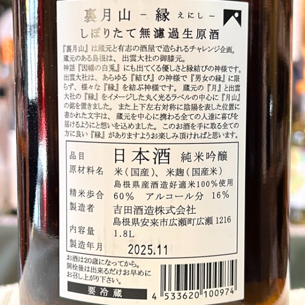 | 銘柄名 | 裏月山縁 純米吟醸 しぼりたて 無濾過生原酒 |