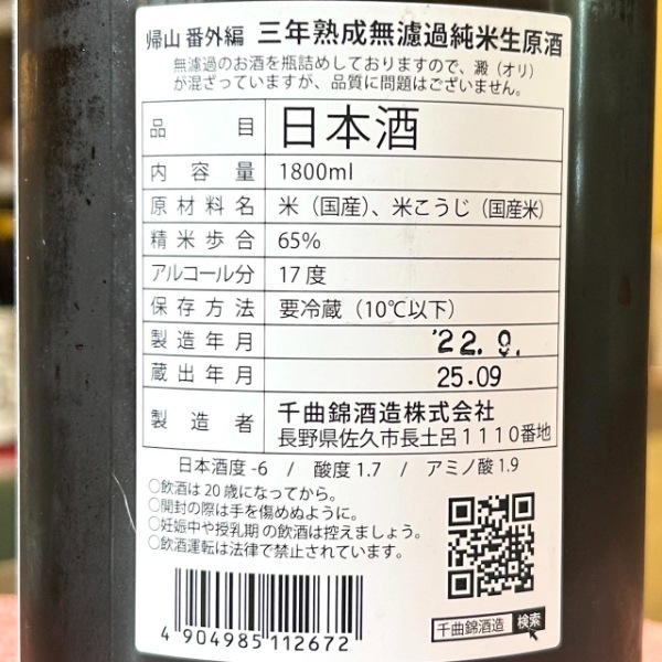 | 銘柄名 | 帰山 Extra Edition 三年熟成無濾過純米生原酒 |