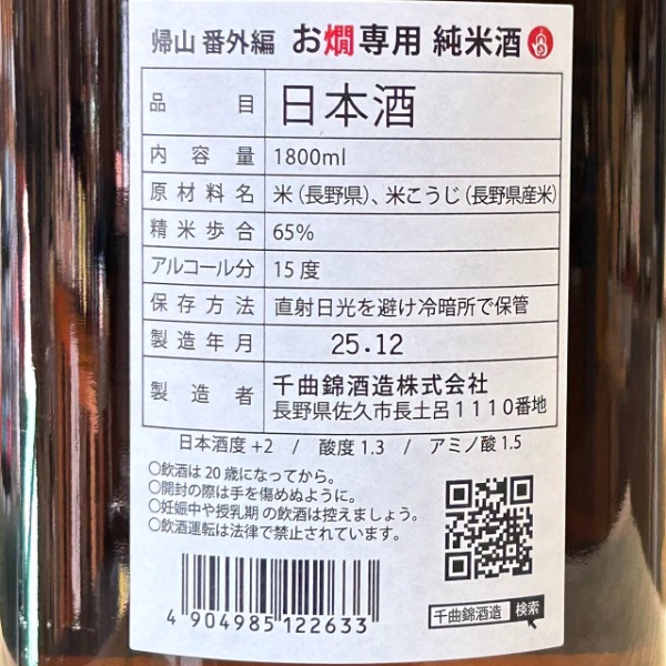 | 銘柄名 | 帰山 Extra Edition 純米酒 お燗専用 |
