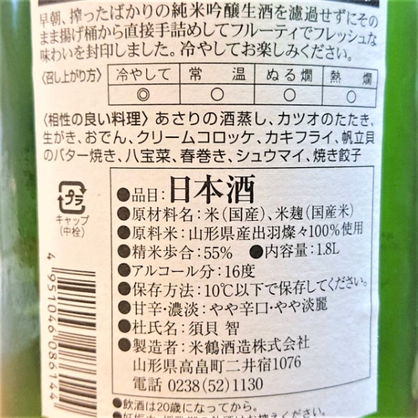 | 銘柄名 | 米鶴 純米吟醸 直汲み 無濾過生 |