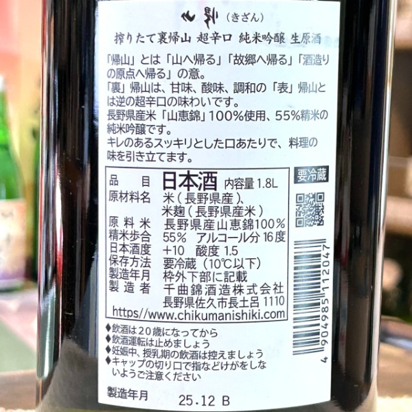 清酒、蕎麦焼酎の「帰山」は地酒特約店専門の銘柄。(「千曲錦」が一般流通酒。)「お酒の本来の旨みは甘味と酸味、最後に人が帰ってくるのはこの味わい」というコンセプトを元に造られ、「帰るべきところ」という意味で「帰山」と命名されました。