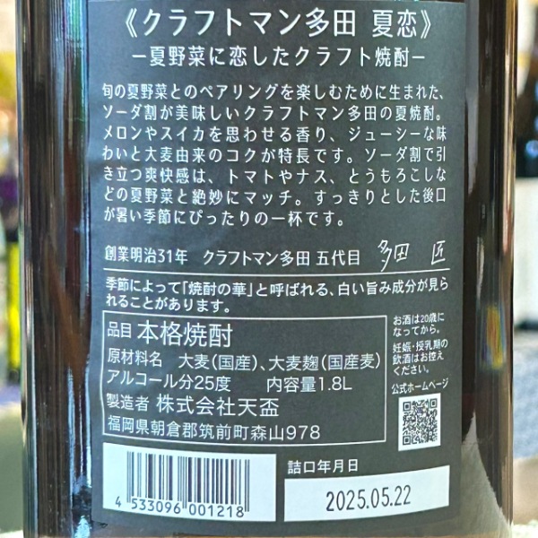 | 銘柄名 | クラフトマン多田 夏恋 -夏野菜に恋したクラフト焼酎- |