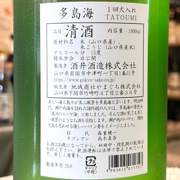 山口銀行の子会社である地域商社やまぐちが、山口県内の酒蔵とコラボし、山口の酒を全国に広める企画酒「多島海(たとうみ)」。仕掛け人は地域商社やまぐちの社員で、元獺祭の蔵人である高木さん。高木さんは板橋区の生まれで、当店は以前から仲良くさせて頂いています。
